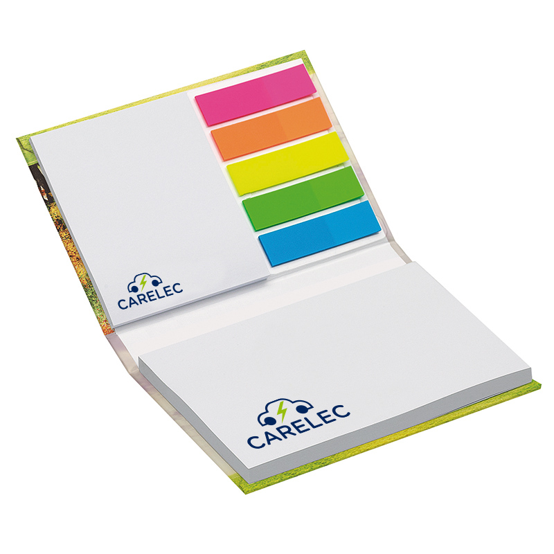 Cet ensemble à 2 blocs papier repositionnables (1 x 100 feuilles de 100 x 72 mm et 1 x 25 feuilles de 50 x 72 mm imprimés en quadri ) + 5 blocs de 20 marques pages de 12 x 45 mm dans 5 couleurs différentes. Il est présenté sous forme de carnet publicitaire avec couverture rigide d'épaisseur 1,75 mm avec finition verni extérieur et impression quadri à l'extérieur. Livré sous sachet individuel. Marquage maxi sur couverture 17,3 x 10,7 cm, sur grand bloc 10 x 7,2 cm - sur petit bloc 5 x 7,2 cm, prévoir bord tournant de 3 mm.