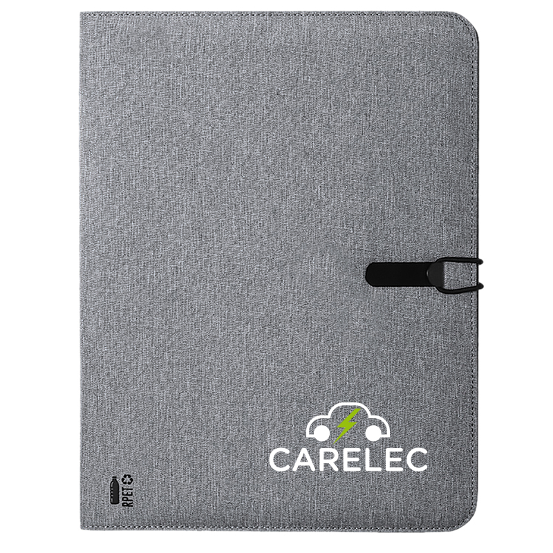 Conférencier publicitaire A4 en polyester PET recyclé (RPET). Fermeture par élastique sur la plaque métal. Plusieurs compartiments de rangement pour cartes et documents. Passant pour stylo (livré sans stylo). Équipé d’un bloc papier de 20 feuilles lignées. Imprimé RPET sur la couverture.