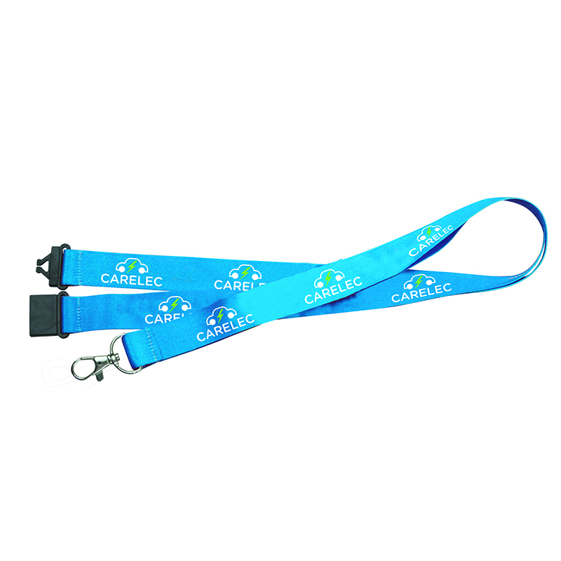 Cette lanière tour de cou à personnaliser a une sangle en polyester de 2 cm de largeur avec mousqueton métal.